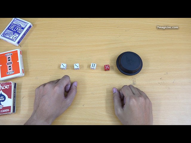 Taking one dice into the black box and crush the second dice with the other hand. Open the black box the dice appear in the box.