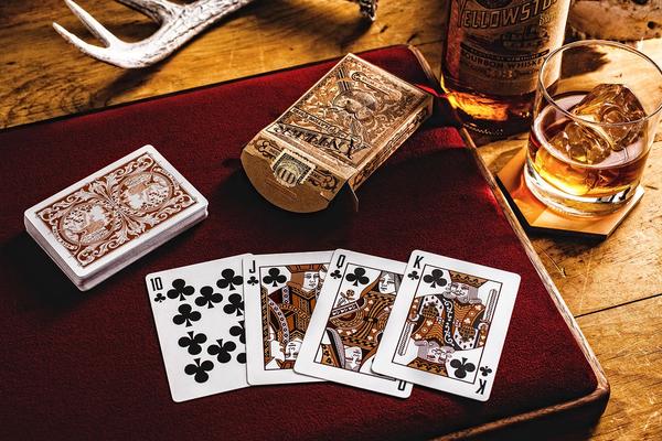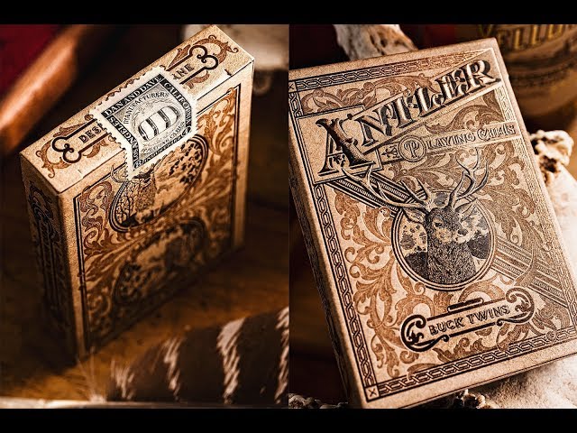 The Tobacco Brown back design features two Twin Bucks enshrined within beautiful flourishes that mimic the lush forest of Yosemite National Park. The Ace of Spades features a noble Buck with herbaceous ornamentation crowning his dignified antlers, and each Joker offers the Antler name. The tuck case is letterpress printed on premium craft paper with foil accents and sculptural embossing.