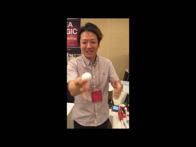 Next, he shows the white silk again, but, in the blink of an eye, the silk disappears. He opens his hand to reveal another egg, which he cracks on the edge of a glass. The real egg yolk drops into the glass and the jaws of the audience drop in amazement.