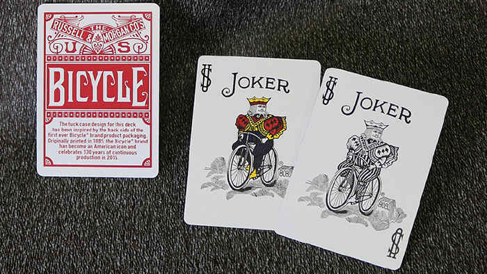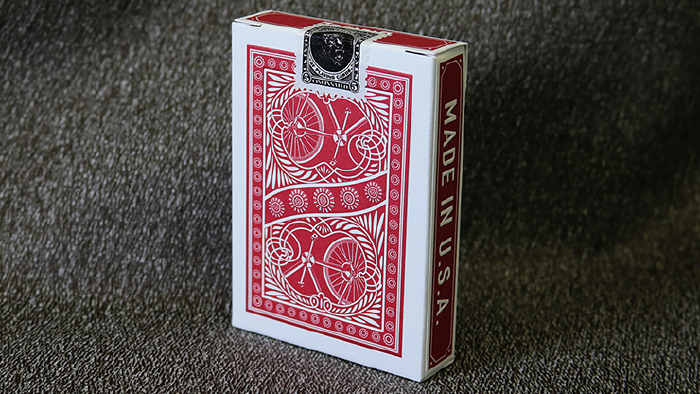 The tuck case design for this deck has been inspired by the back side of the first ever Bicycle® brand product packaging. Originally printed in 1885, the Bicycle® brand has become an American icon and is celebrating 130 years of continuous production in 2015. This deck features a vellum tuck stock and embossed tuck elements.