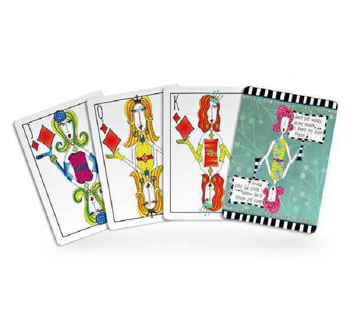 The Dolly Mama deck is a fun and witty premium 54-card deck featuring the whimsical imagery of artist Joey Heiberg. The Tuck and Backs of this unique deck features humorous artwork by Joey that will delight every collector. In Joey’s world, “different is beautiful and dreams come true because there are no fears”.