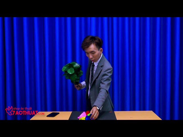 A beautiful and good-looking colorful bouquet is seen in magician’s hand which possesses five big flowers. He parts flowers off bouquet and puts them in a zip bag, he spreads a handkerchief over bouquet afterwards.