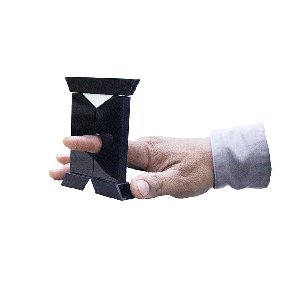 The magician invites a spectator to insert her finger into a hole that passes through a transparent frame. He then slides a solid blade into the top slot… and lowers the blade. Magically, the blade penetrates completely through the spectator’s finger!
