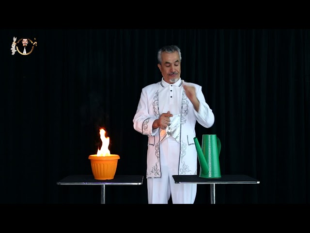 Magician shows an empty vase and convince everyone the vase is totally empty….while he still holds it in his hand a strange fire ignites in the vase….the magician tries watering it with a nearby water sprinkle to turn off the fire without success…. he tries to make the fire fade away by putting the sprinkle on the vase and by doing so the fire is stopped at once and once the magician takes the sprinkle away from the vase; a beautiful big flower bouquet appears instead of fire….