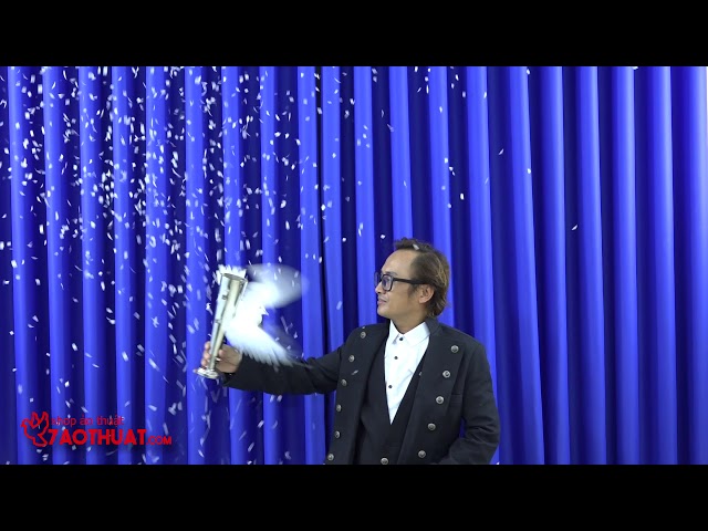 The magician brings to the stage a shiny metal trophy and then suddenly “bang” a loud bang, after the explosion is a whole space with white snowflakes from the tube.