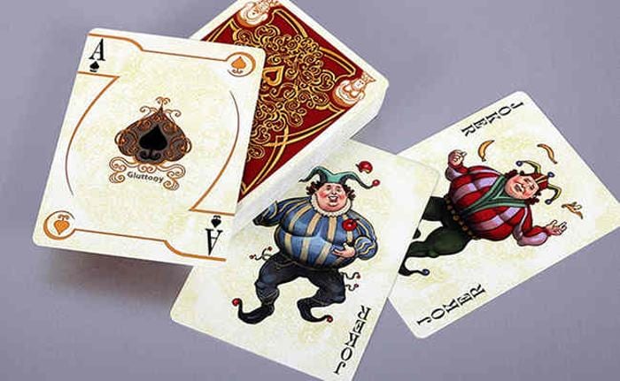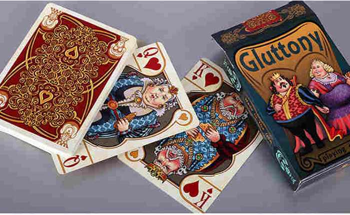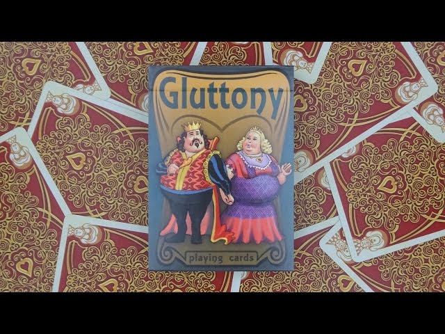 Live the good life with the Gluttony deck by Collectable Playing Cards. Excessive eating has become the new norm, but back in the day good eats were a luxury. This deck combines both comedy and elegance with its royal greens and golds along with curvy patterns. It is a great addition for any collector and can fit in many different themed deck sets. COLLECTABLE PLAYING CARDS Printed by USPCC 100% hand drawn artwork and custom pips Custom stamp seal Air-Cushion Finish The overweight Royal family look healthy and….happy as they munch on their nutritious food. The Jacks try desperately to lose a few while the Kings are contempt with their chicken leg dinners. The aces and numbered cards show off the true brilliance of the design. Again, very curvy with nicely sized pips and slim numbers. Even the Jokers are in on the eating action, but like the Jacks they are choosing a healthier route.