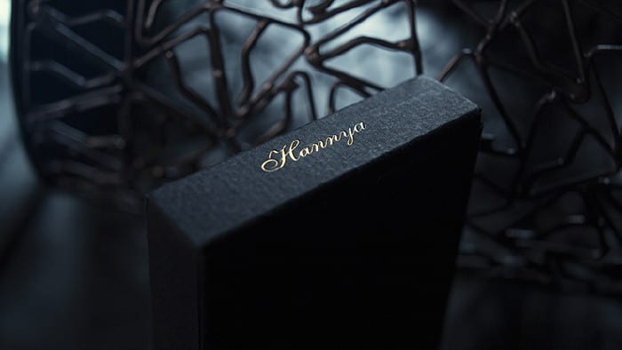 When looking straight ahead, the mask appears frightening and angry; when tilted slightly down, the face of the demon appears to be sorrowful, as though crying. In much the same way, the gold foil mask on the Hannya Playing Cards tuck case emerges from the black mat darkness and peers into your soul.