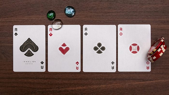 This is a unique design of the Invasion Playing Cards “Blood edition” with the inverted back pattern. Fully custom Courts and pips were designed with an alien theme. Four alien races represent four different suits. Each suit follows each’s own theme; however, all four of them follow one big theme – being badass! This deck was inspired by sci-fi stories, comics, and films.