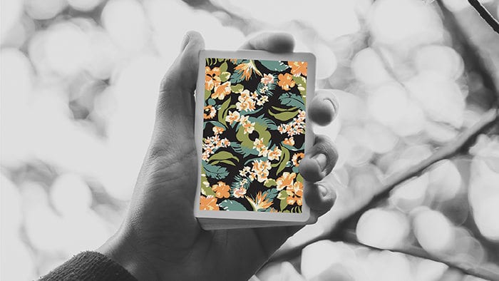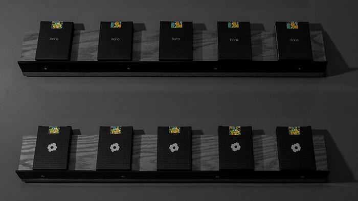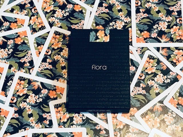 The theme of the Flora deck is carried throughout. The box features the word ‘Flora’, or the closest equivalent, written in 25 different languages in both striking metallic grey ink as well as matte finish, white foil.