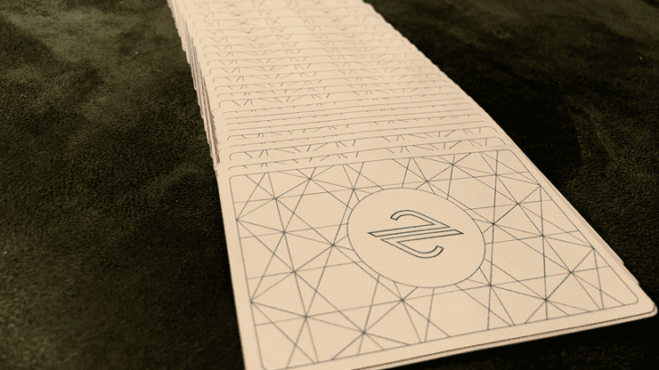 The tuck box has this same design wrapped around the bottom with a gradient fade to white, giving a subtle hint to what you will experience when you open the cards. The MIRZ symbol is featured on the back of the tuck box, while the top has the suits in CHASED (Clubs, Hearts, Spades, Diamonds) order.