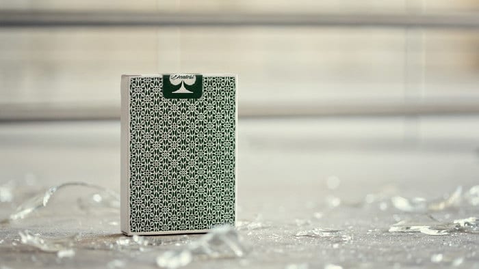 Easy to fan and buttery smooth, these cards have been printed to Daniel’s specifications.  The tuck case is white and features a minimalist design, including solely the name of the playing cards, the text “Luxury Playing Cards”, and Daniel Madison’s logo in Erdnase green. The back of the tuck case features the back design of the cards themselves. The back design of the cards also includes a special marking system developed by Daniel. The deck is standard 52 and comes with 2 additional custom jokers, a double backer, and an ad card. The deck also offers two reveals that can be used in a wide variety of tricks. The court cards feature a custom Anglo-American style design.