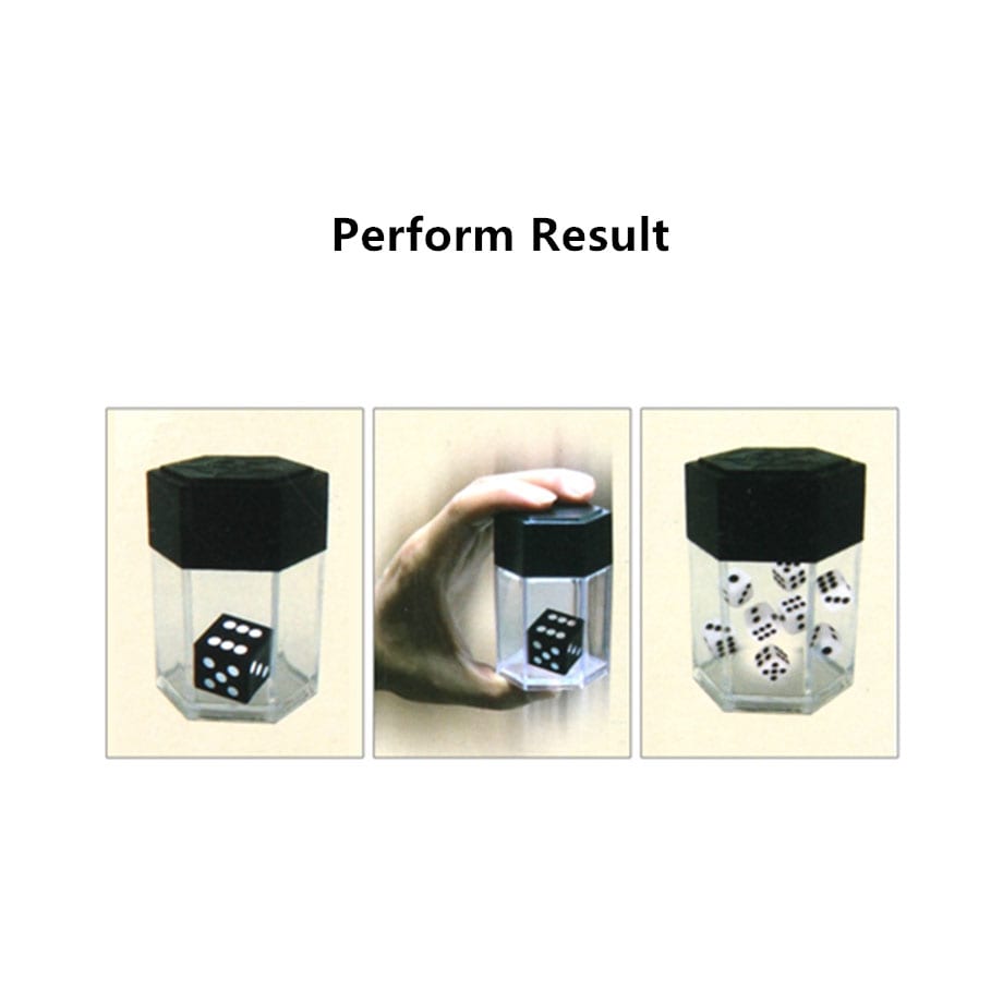The container is opened and the small dice can be examined by audience while the large dice vanishes without a trace.