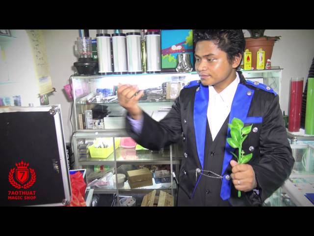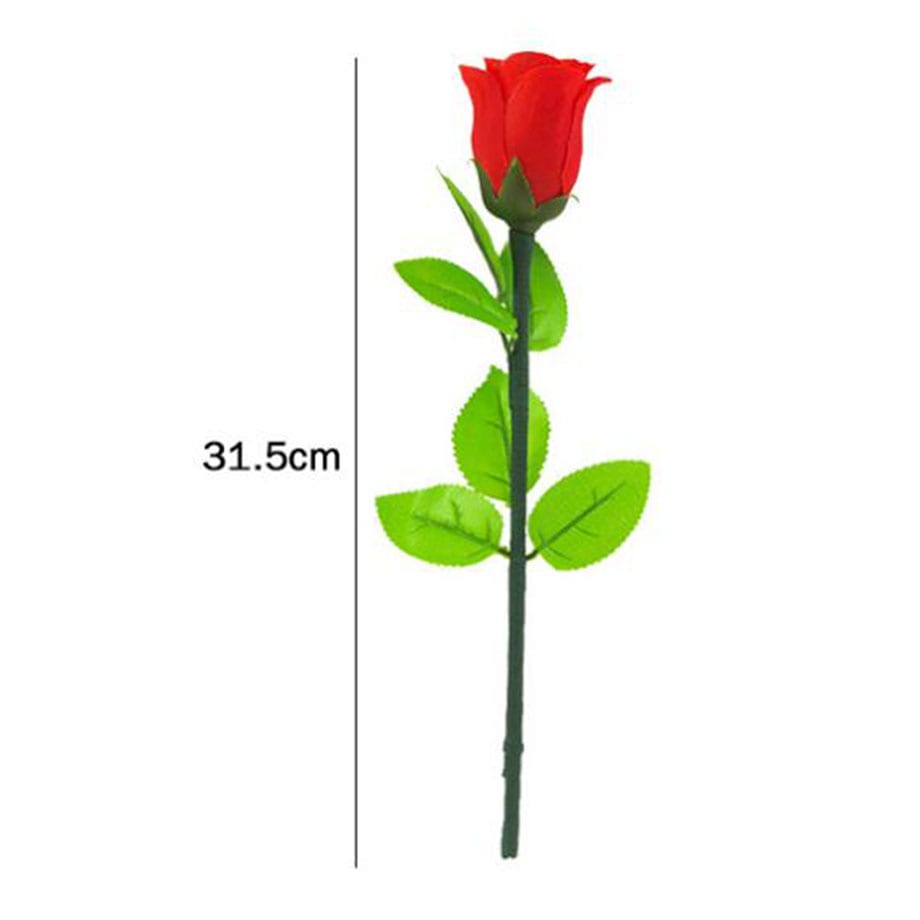 You show a red scarf on both sides, then slowly push the scarf into your closed fist. Now you show your audience a stalk having leaves but no flower. You then bring your closed fist above the stalk, like you were placing the crumpled scarf on top of it. When you open your fist a Beautiful Rose has appeared on top of the stalk!