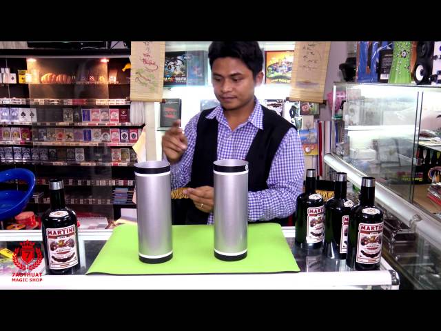 The magician shows an empty tube and a shining black bottle to the audience. Then he puts the bottle inside the tube and takes out a bottle with a “different color.”