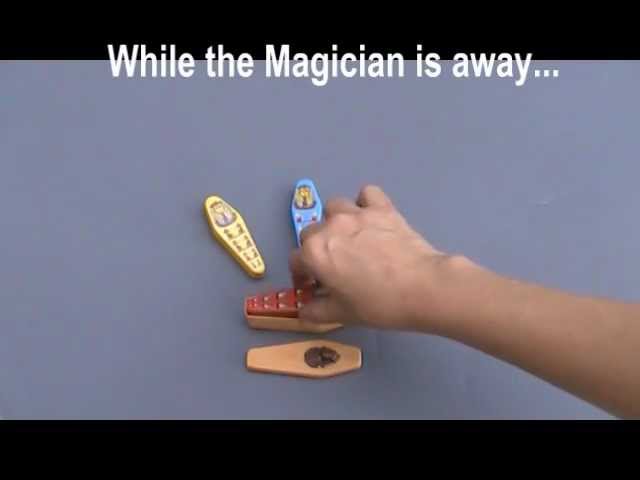 The magician displays a small “coffin” and three plastic mummies-red, yellow and blue. He then turns his back and a member of the audience places any mummy into the coffin, then hides the other two.