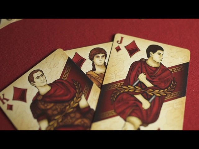 The back card for the ROME: Augustus Deck is truly one of the most unique back cards in the world of playing cards! Featured on each half are the Ancient Roman cityscape and a closeup of the Augustus statue. The center banner is at the inverse angle of the Face Cards’ banners.