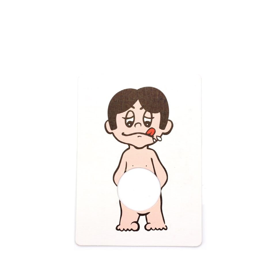 Magician holds three different cards in his hand; let audience see the number of middle card. Magician place the tree cards on the table face down, take away the two cards on the left and right, only middle card left with a hole, take it and ask audience put a finger on the hole, then turn over the card, the face of card will turn to a man.