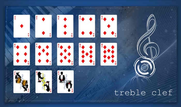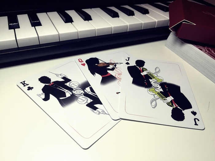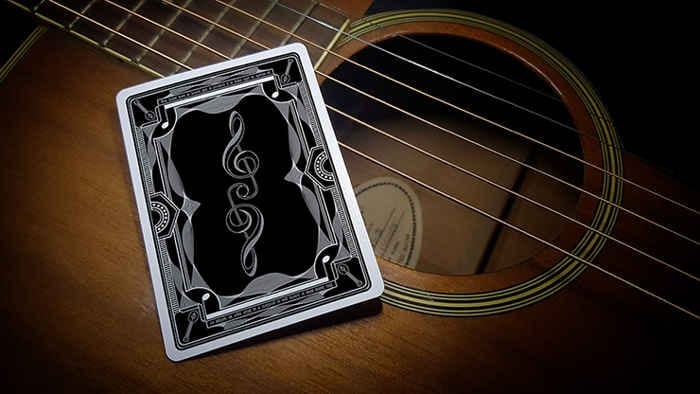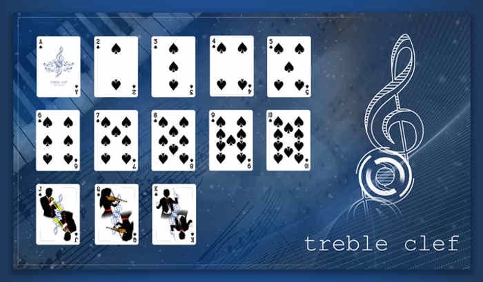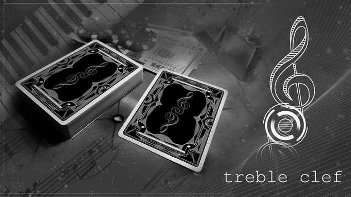 Treble Clef is a custom deck of playing cards inspired by classical music. Treble Clef Playing Cards is functional, and all 52 cards are fully marked with suits and values. If you are a magician, then you would be able to find your spectator\’s card without seeing the face of the card. This deck is elegant and well-designed. On the back, it is filled with luxurious, white-detailed line art with classy, blue-colored background. The symmetry treble clef logo in the middle is absolutely stunning. On the face, the instrument players and the conductor exude feelings of an orchestra. Designers: John Yohan Cho/JD14 Customized Ace of Spades, Court cards and Jokers Marked deck Printed by JJPC (Called WJPC in China) Butter Finish Limited edition (1000 decks) …