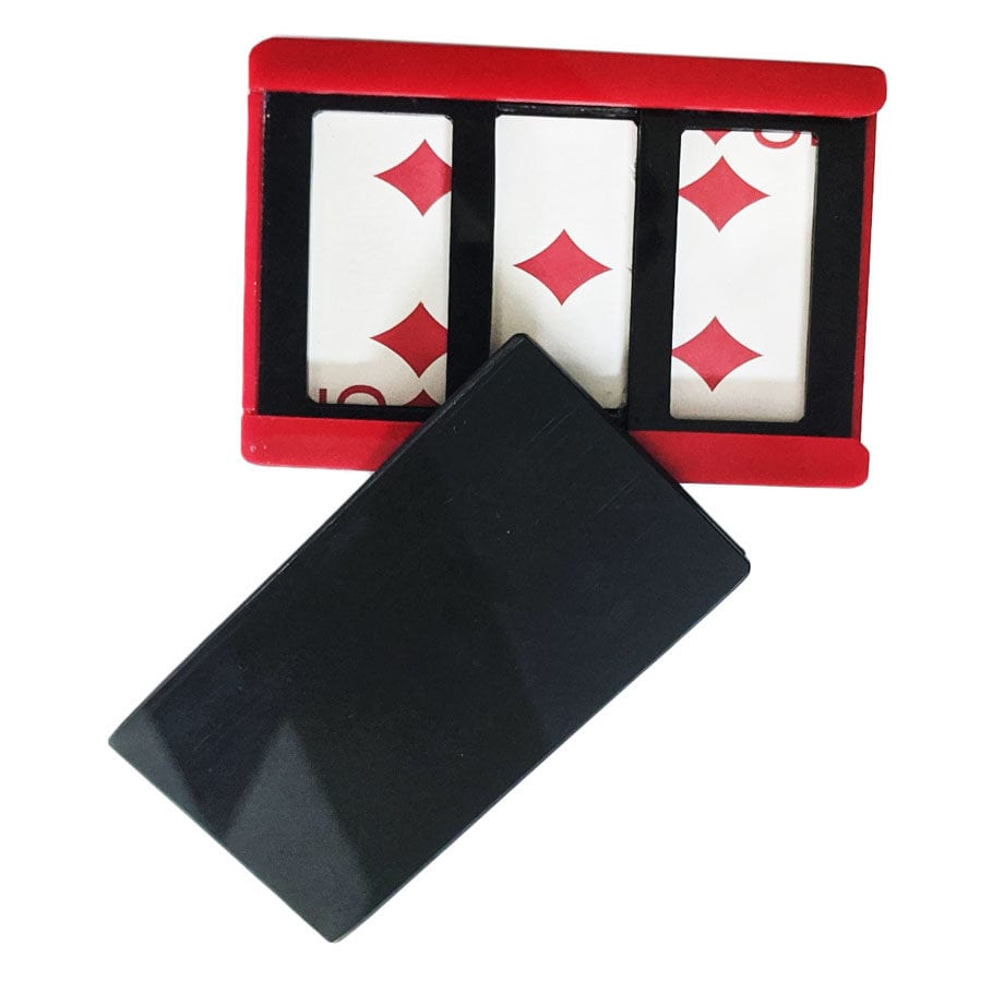 An extremely interesting product to combine with the deck. If you’ve ever felt very impressed with the three-person cut game, this is really a mini version of the repertoire above. A card is randomly selected by the audience, then the magician puts the card into a frame and cuts it into three parts, of course the audience sees it from start to finish.