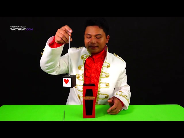 A feature trick – made in full stage size with improvements for easier handling. A special patter story accompanies this effect which explains about vampires in general and one in particular. The block is dropped into the tube and is visible through the open front. A solid, wooden rod is passed through the tube and the block, thus holding the block securely. The tube is now inverted and, in accordance with the patter story, the audience sees the block pass visibly out of the tube, through the solid rod. This is a startling climax to a most entertaining feat of magic. The block is lacquered in bright red. The tube is yellow, with red and black highlights, covered with an eerie bat design. The rod is painted silver (a silver spike for the vampire!).