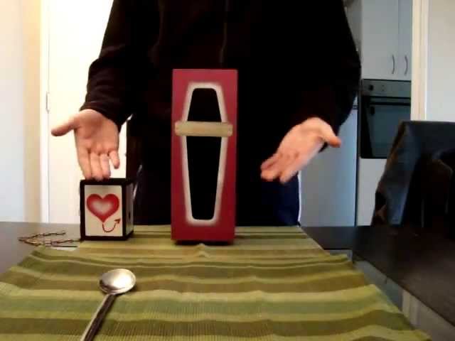Note: This effect is easily redecorated by the magician during the Christmas season so that the block represents Santa Claus and the tube represents a chimney he got stuck in. The magician comes to his rescue and Christmas is saved for all the boys and girls.