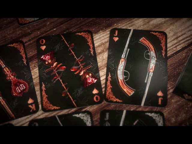 THE VICTORIAN OBSIDIAN DECK is composed of fifty-two cards and two jokers, replacing the traditional court cards by 3D Victorian inspired elements (scepter for the king, rose for the queen and pistol for the jack) are depicted on black backgrounds with an intricate pattern.